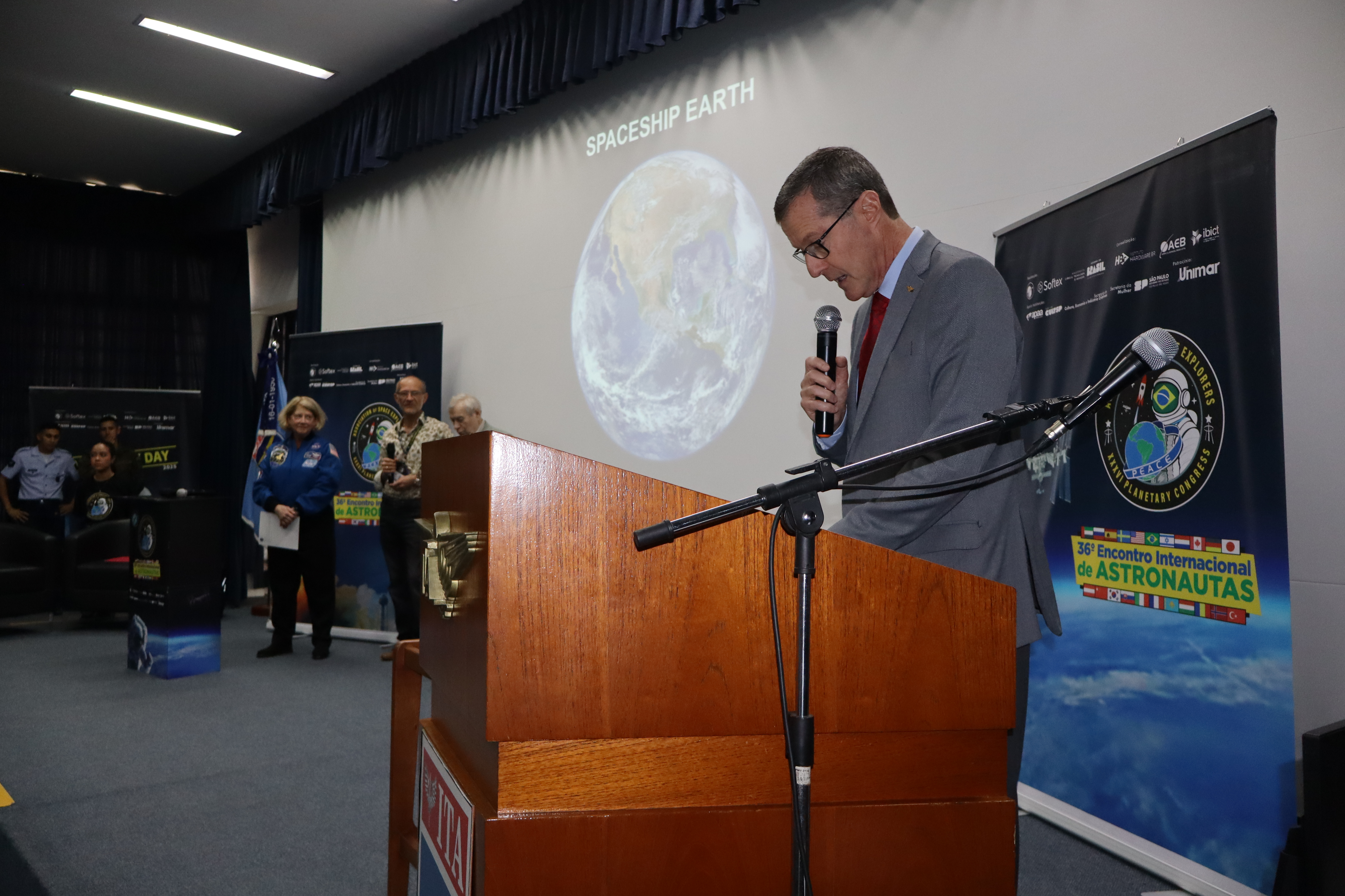 O Instituto Tecnológico de Aeronáutica (ITA) recebeu, nesta quarta-feira (6 de novembro), a astronauta americana Pamela Ann Melroy e o cosmonauta russo Aleksandr Pavlovich Aleksandrov para uma palestra e troca de experiências com estudantes de graduação e parte do efetivo do Departamento de Ciência e Tecnologia Aeroespacial (DCTA). A atividade foi organizada pela Association of Space Explorers (ASE) e integra a programação do 36º Planetary Congress, realizado pela primeira vez no Brasil.