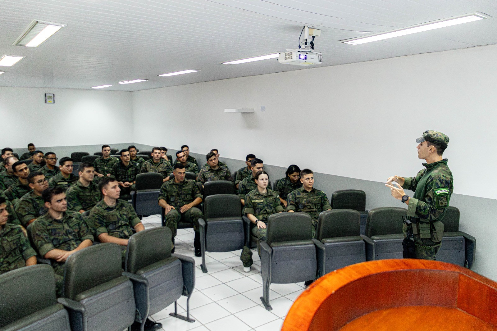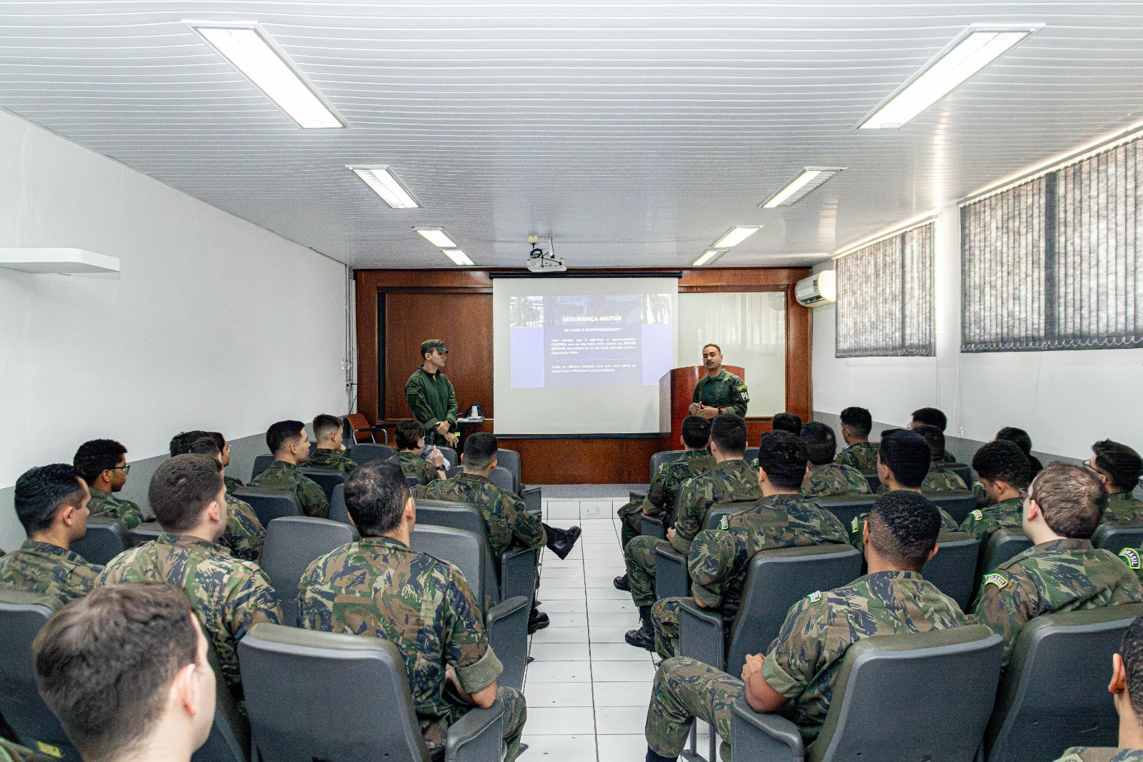 Durante o período, o Tenente Gustavo de Souza Morales e o Tenente Vitor Bertollo de Carvalho conduziram instruções no campo da Segurança Militar, abordando, de forma estruturada, conteúdos essenciais à formação do Oficial. Entre os temas tratados estiveram as Normas de Segurança e Defesa (NOSDE), os Serviços de Escala destinados a Oficiais Subalternos e outros aspectos diretamente relacionados à rotina administrativa e operacional das Organizações Militares.
